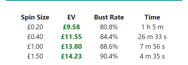 Generally, a £1 spin size represents a good compromise between the EV and bust out rate when wagering most bonuses, so this is what we would recommend.